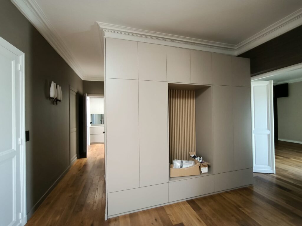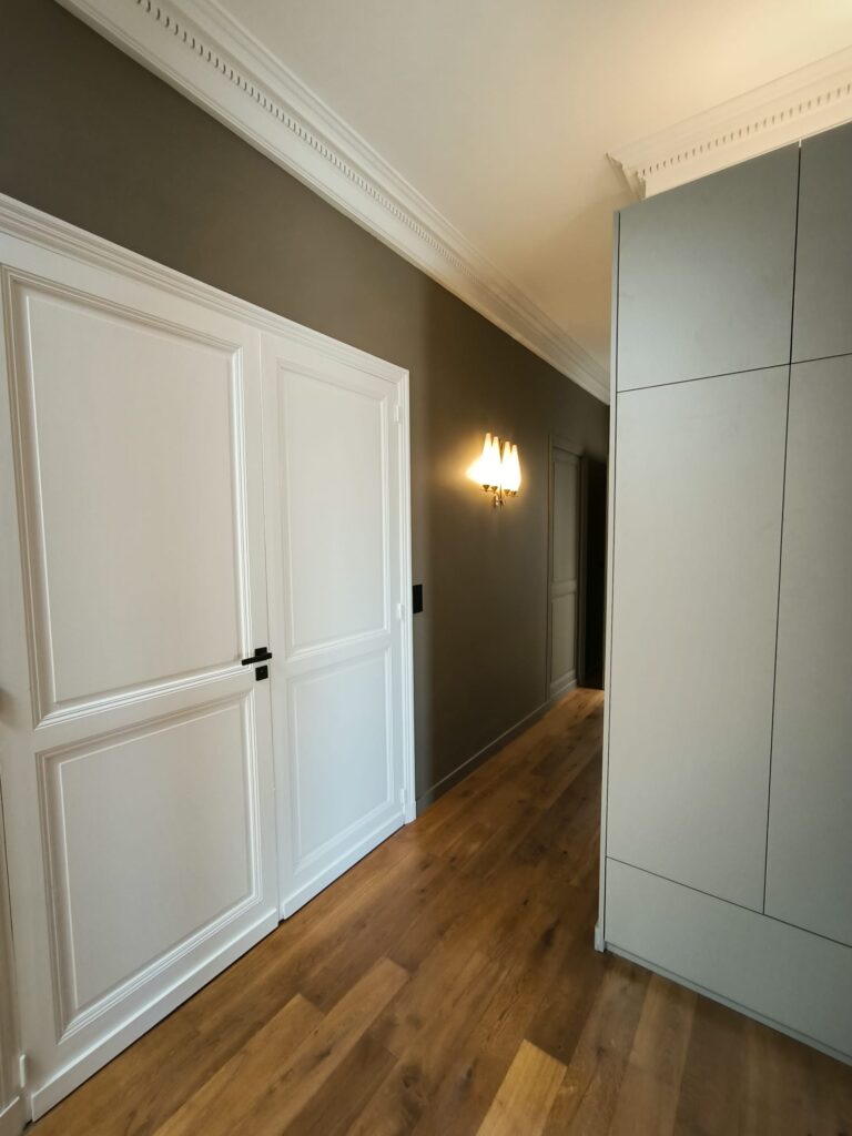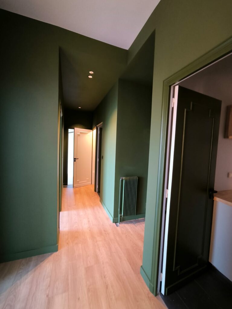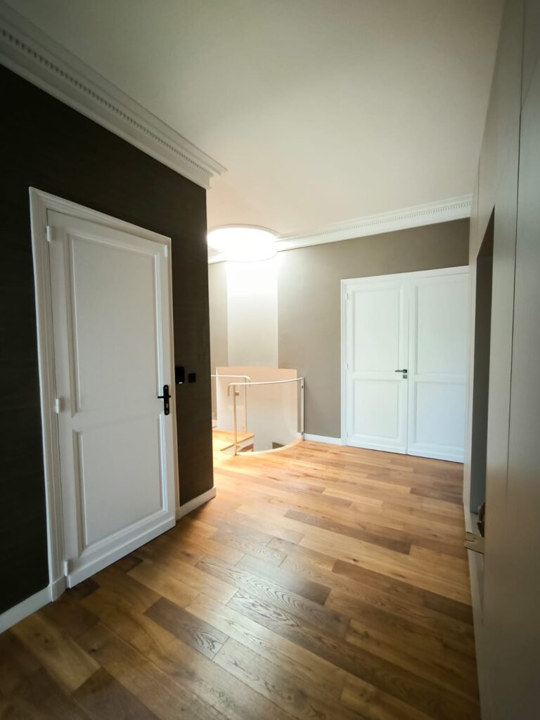 Les portes et les plinthes ont été repeintes avec une laque satinée microporeuse, offrant une finition durable et raffinée, ce traitement permet non seulement de protéger les boiseries, mais aussi d’ajouter une touche esthétique à l’ensemble des pièces.