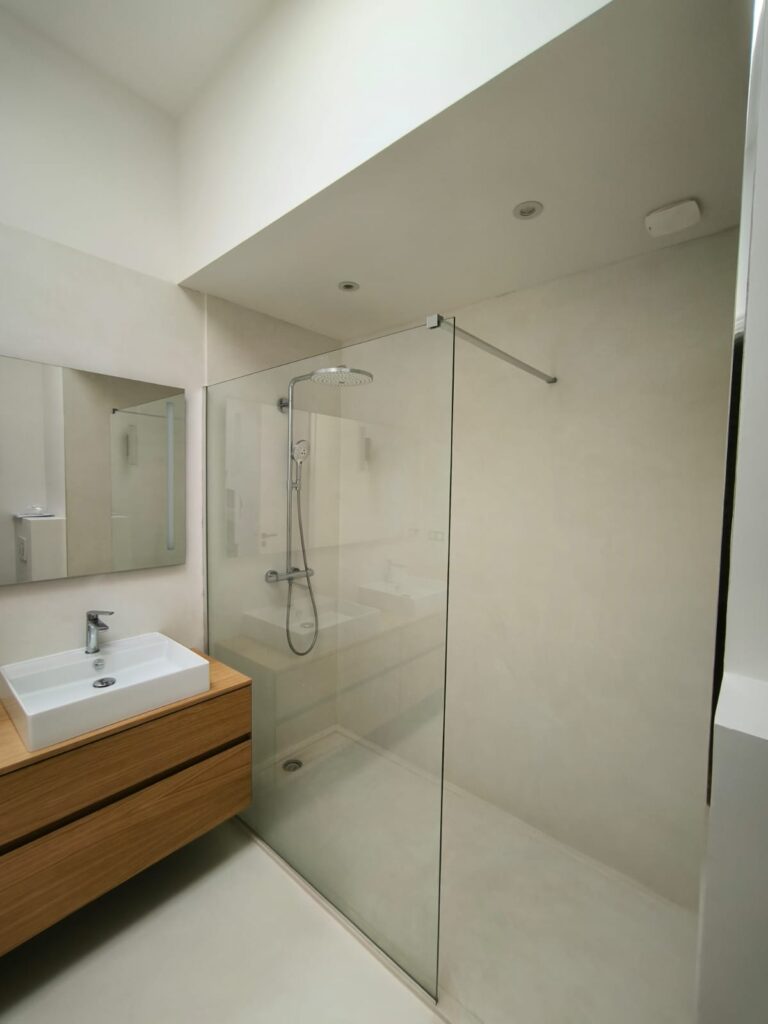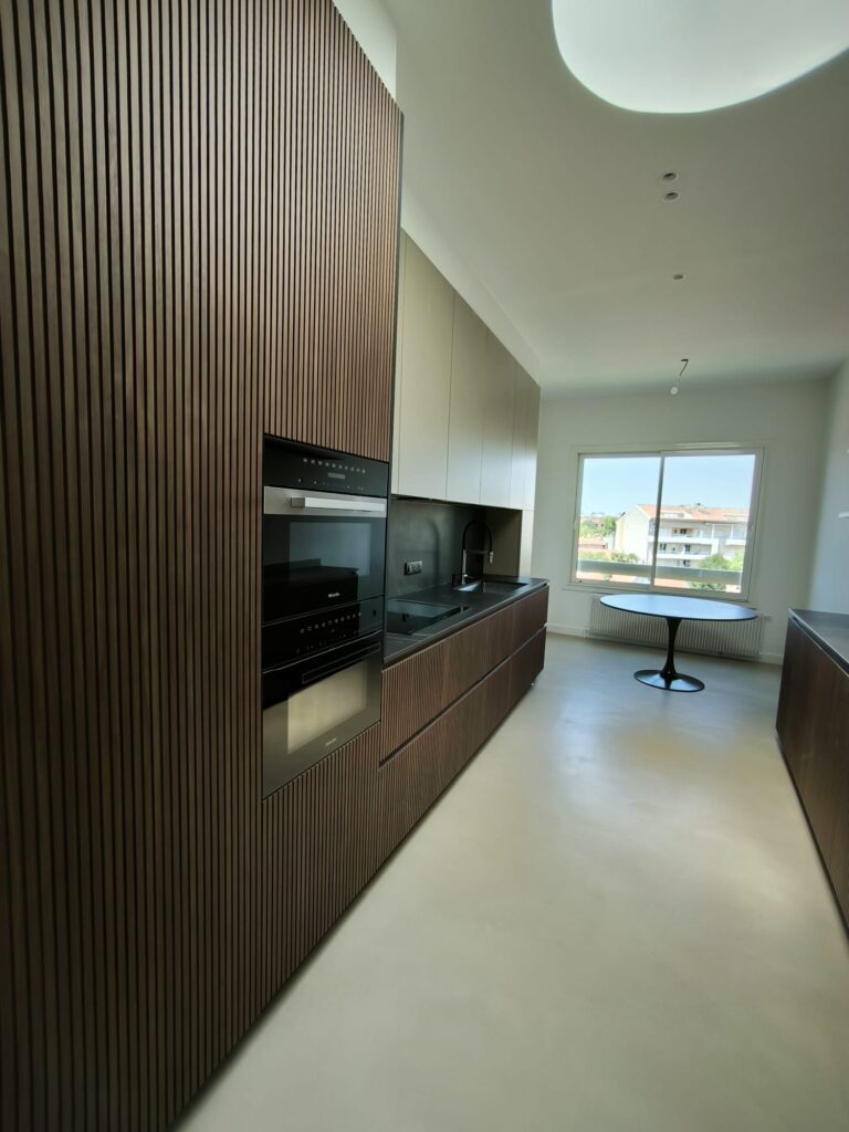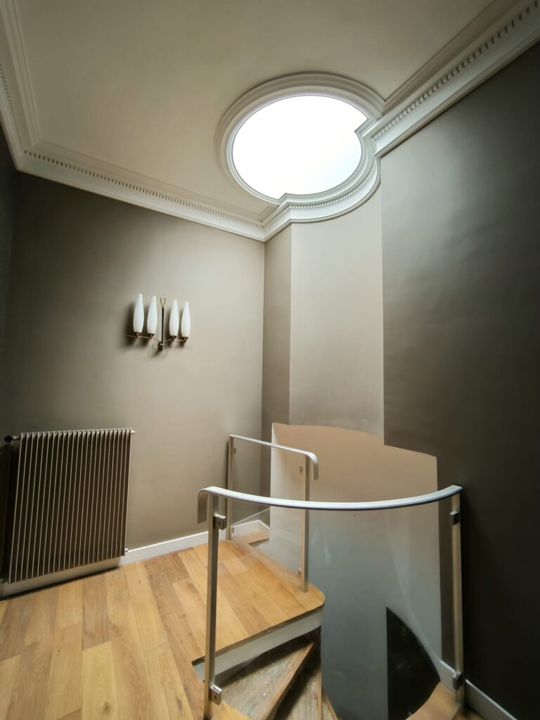 Plafonds et murs : Deux couches de peinture ont été appliquées, avec une finition mate pour les plafonds et une peinture velours pour les murs, apportant un aspect chaleureux et élégant à l’intérieur du duplex.
