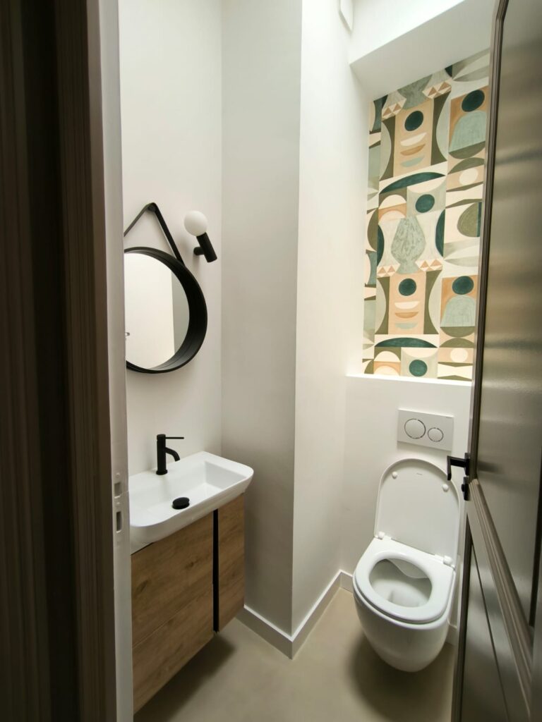 Pour ajouter de la texture et de la personnalité aux espaces, nous avons également procédé à la dépose du revêtement mural existant et à la pose de papier peint de qualité, ce choix de finition permet de dynamiser l’espace tout en respectant l’harmonie globale des pièces.